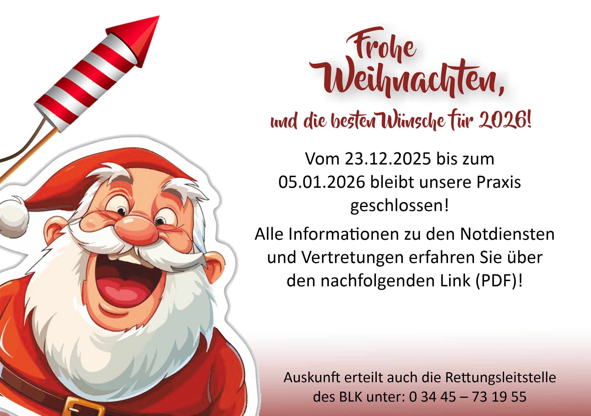 Informationen zum Zahnärztlichen Notdiest am Wochenende und an Feiertagen finden Sie in der lokalen Presse (MZ; Wochenspiegel, Supersonntag), oder über die BLK-Rettungsleitstelle: 0 34 45 - 7 52 90
